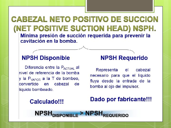 Cavitación de succión La cavitación de succión ocurre cuando la succión de la bomba se encuentra en unas condiciones de baja presión/alto vacío que hace que el líquido se transforme en vapor a la entrada del rodete. Este vapor es transportado hasta la zona de descarga de la bomba donde el vacío desaparece y el vapor del líquido es nuevamente comprimido debido a la presión de descarga. Se produce en ese momento una violenta implosión sobre la superficie del rodete.
