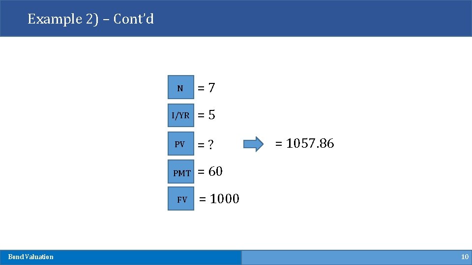 Example 2) – Cont’d N = 7 I/YR = 5 PV = ? PMT = 60 FV Bond Valuation = 1057. 86 = 1000 10