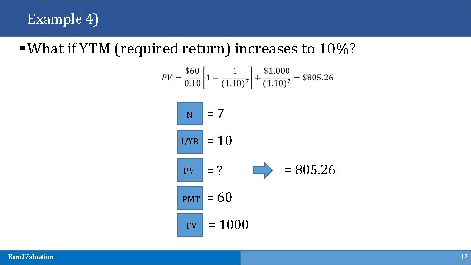 Example 4) § What if YTM (required return) increases to 10%? N I/YR = 10 PV = ? PMT = 60 FV Bond Valuation = 7 = 805. 26 = 1000 12