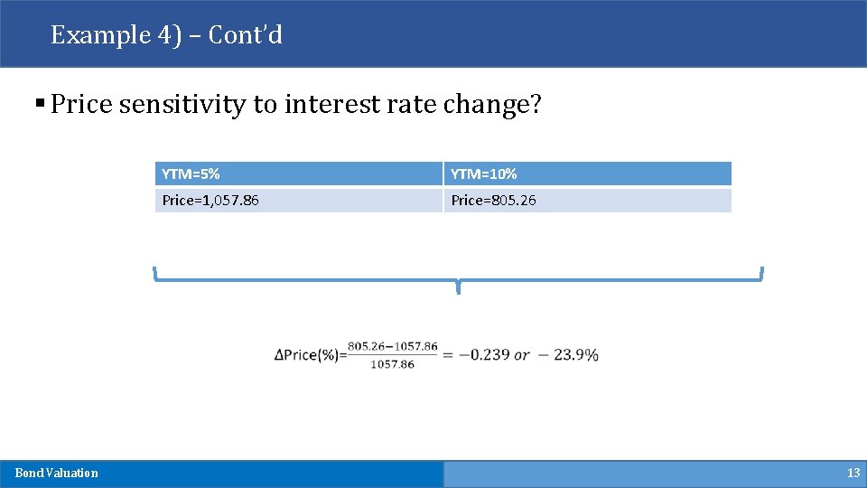 Example 4) – Cont’d § Price sensitivity to interest rate change? YTM=5% YTM=10% Price=1, 057. 86 Price=805. 26 Bond Valuation 13