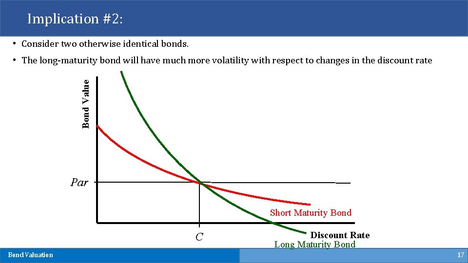 Example 5) § Two bonds with coupon rate 10%, trading at par. One has 1 year to maturity, the other has 10 years to maturity. Interest rate increases to 12%, what will be the prices of two bonds? YTM=12% YTM=10% Short-Maturity Bond Long-Maturity Bond Price=1000 Price=982. 14 Price=886. 99 Bond Valuation 16