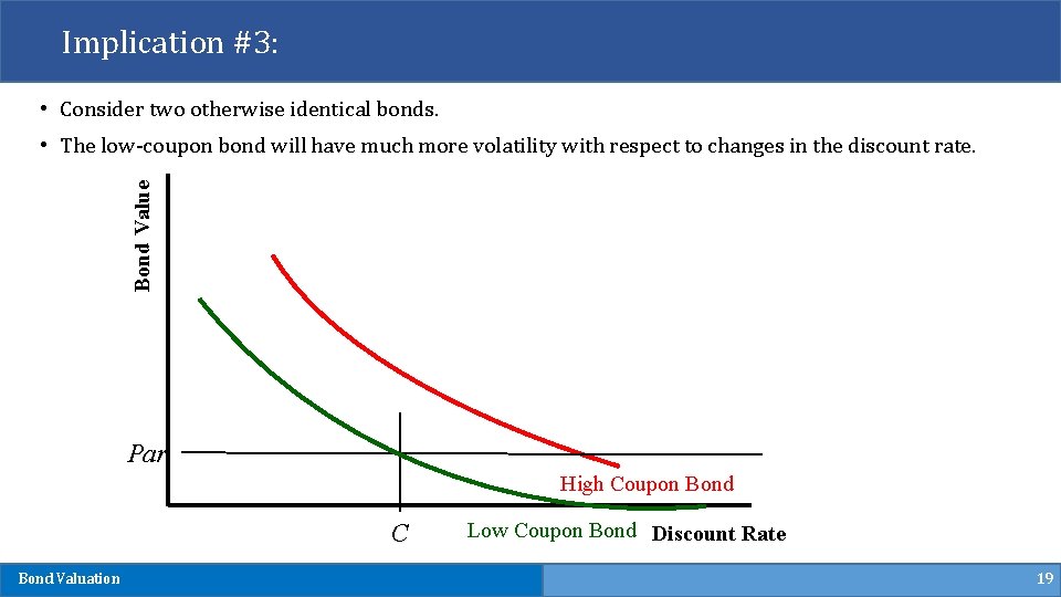 Implication #3: • Consider two otherwise identical bonds. Bond Value • The low-coupon bond will have much more volatility with respect to changes in the discount rate. Par High Coupon Bond C Bond Valuation Low Coupon Bond Discount Rate 19