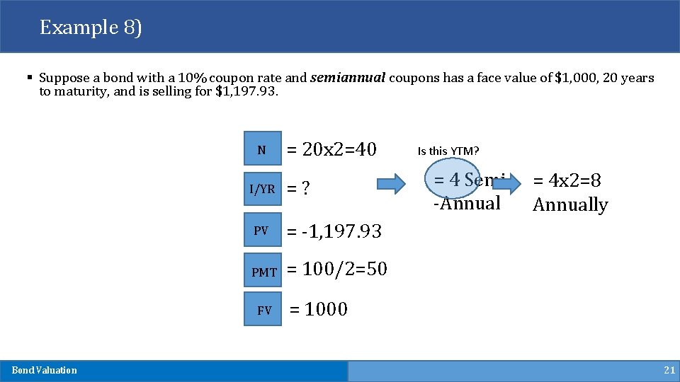 Example 8) § Suppose a bond with a 10% coupon rate and semiannual coupons has a face value of $1, 000, 20 years to maturity, and is selling for $1, 197. 93. N I/YR = ? PV = -1, 197. 93 PMT = 100/2=50 FV Bond Valuation = 20 x 2=40 Is this YTM? = 4 Semi -Annual = 4 x 2=8 Annually = 1000 21