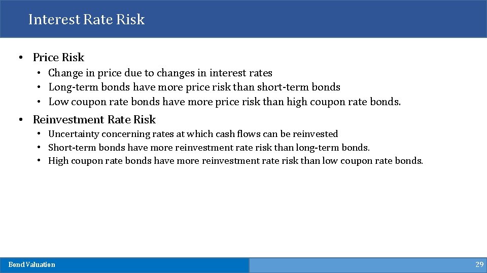 Interest Rate Risk • Price Risk • Change in price due to changes in interest rates • Long-term bonds have more price risk than short-term bonds • Low coupon rate bonds have more price risk than high coupon rate bonds. • Reinvestment Rate Risk • Uncertainty concerning rates at which cash flows can be reinvested • Short-term bonds have more reinvestment rate risk than long-term bonds. • High coupon rate bonds have more reinvestment rate risk than low coupon rate bonds. Bond Valuation 29