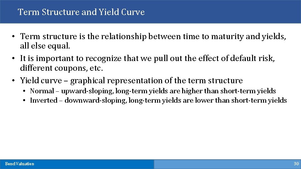 Term Structure and Yield Curve • Term structure is the relationship between time to maturity and yields, all else equal. • It is important to recognize that we pull out the effect of default risk, different coupons, etc. • Yield curve – graphical representation of the term structure • Normal – upward-sloping, long-term yields are higher than short-term yields • Inverted – downward-sloping, long-term yields are lower than short-term yields Bond Valuation 30