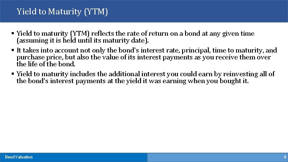 Example 1) § Let’s look at this two bonds: IBM Coupon Rate=2. 000% Maturity=01/31/2020 FV=$1000 Price=999. 57 YTM=1. 617% Bond Valuation National Rural Utility Coupon Rate=2. 000% Maturity=01/31/2020 FV=$1000 Price=909. 57 YTM=2. 017% 3