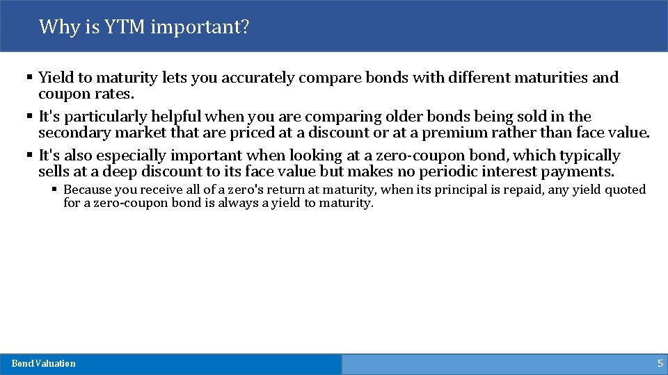 Yield to Maturity (YTM) § Yield to maturity (YTM) reflects the rate of return on a bond at any given time (assuming it is held until its maturity date). § It takes into account not only the bond's interest rate, principal, time to maturity, and purchase price, but also the value of its interest payments as you receive them over the life of the bond. § Yield to maturity includes the additional interest you could earn by reinvesting all of the bond's interest payments at the yield it was earning when you bought it. Bond Valuation 4