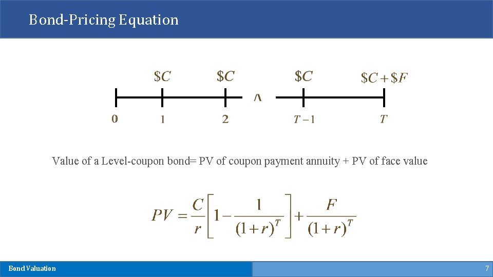 Bond Valuation • Primary Principle: • Value of financial securities = PV of expected future cash flows • Bond value is, therefore, determined by the present value of the coupon payments and par value. • Interest rates are inversely related to present (i. e. , bond) values. Bond Valuation 6