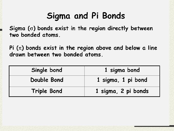 Pi Bond ( ) Pi bonding electrons are likely to be found in a sausage-shape above and below the axis l Pi bonds are weaker than sigma bonds because they overlap less P orbitals overlapping side-by-side
