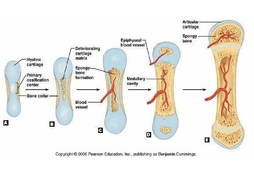 Changes in Bone Through Life • long bone ossification begins at 8 wks • hyaline cartilage “long bones” primary ossification centers - 12 wks • birth mostly epiphysis left • hormones cause growth during childhood and adolescence spurt • bone markings develop with muscles • black males - bones more dense