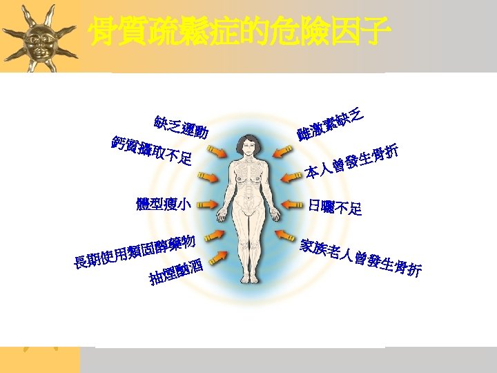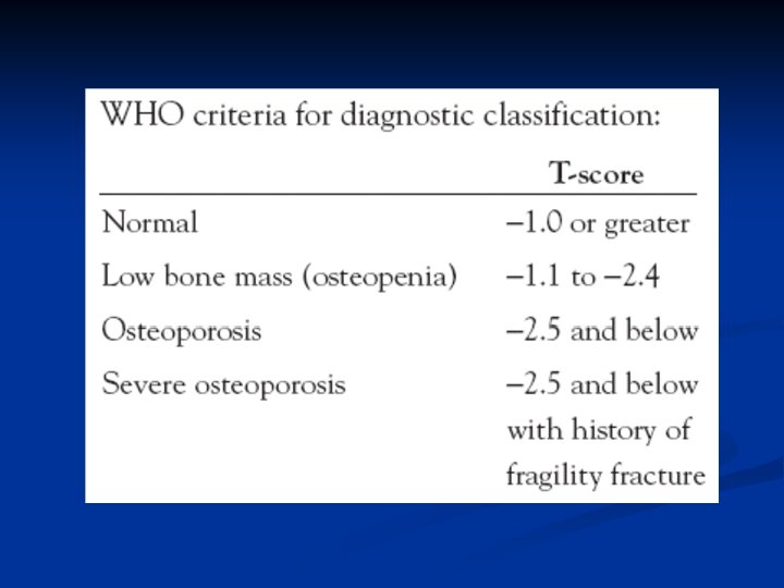 Osteoporosis n Primary osteoporosis n n Older persons and women past menopause in which bone loss is accelerated over that predicted for age and sex. Secondary osteoporosis n Metabolic bone disease n n n Primary prevention n comprehensive measures against other lifestyle-related diseases n Secondary prevention n hyperparathyroidism multiple myeloma or metastatic carcinoma n Malnutrition n Drug therapy n with corticosteroids n Prolonged immobilization n Weightlessness with space travel Should target people at higher risk of osteoporotic fractures Neoplasia n Should provided all the people as n Tertiary prevention n Should be provided the patients and at frail elderly people using medical or long-term care insurance Osteoporosis Tutorial
