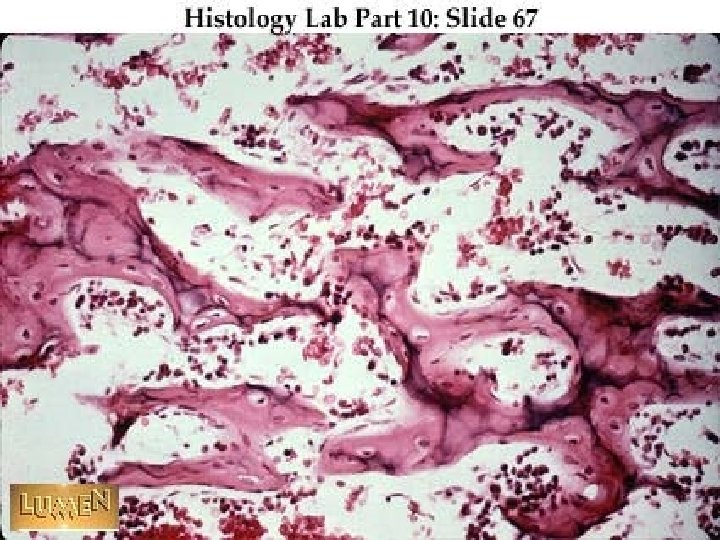 The Trabeculae of Spongy Bone • Latticework of thin plates of bone called trabeculae oriented along lines of stress • Spaces in between these struts are filled with red marrow where blood cells develop • Found in ends of long bones and inside flat bones such as the hipbones, sternum, sides of skull, and ribs. No true Osteons.