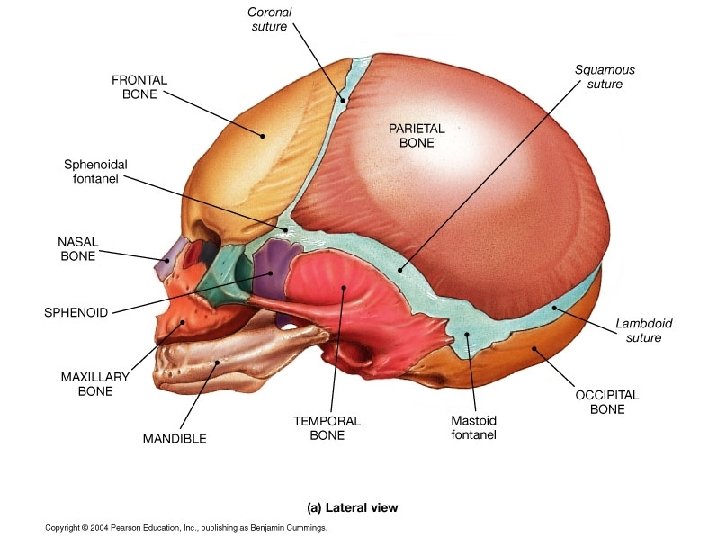 Cranial Bones • Cranial bones create the cranial cavity. • Brain in direct contact with protective membrane in between bones and brain called the meninges. 1 frontal bone 2 parietal bones 2 temporal bones 1 occipital bone 1 sphenoid bone 1 ethmoid bone