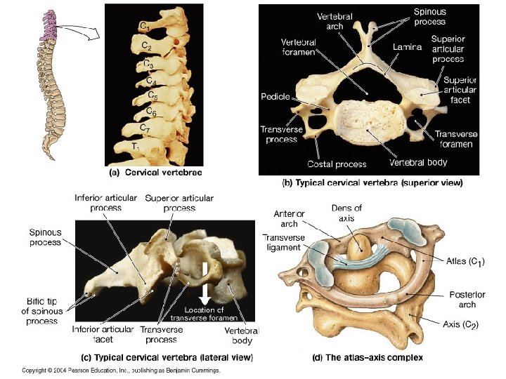 Cervical Vertebrae - 7 bones, (C 1, C 2, C 3 etc. ) C 1 - called the Atlas. - Articulates with occipital condyles. - Has a ‘ring’ like structure (no body). C 2 - called the Axis. - Articulates with the atlas. - Has odontoid process (dens).