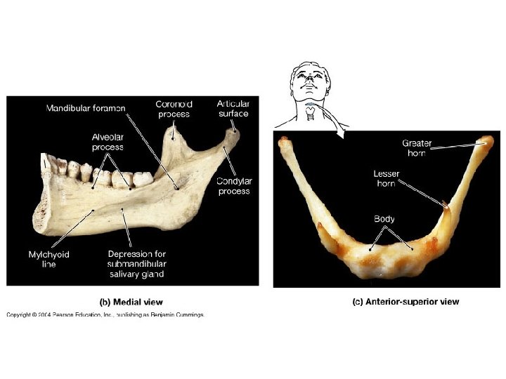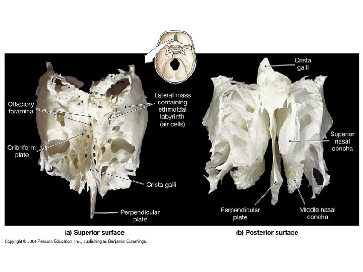 Facial Bones • Facial bones have no direct contact with the brain or meninges. 2 maxillae bones 2 palatine bones 2 zygomatic bones 2 lacrimal bones 2 nasal bones 2 inferior nasal conchae 1 vomer 1 mandible