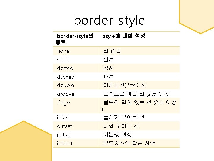 border을 입력하는 방법(부분적용) 요약: border-bottom: 5 px bottom yellow; width/style/color