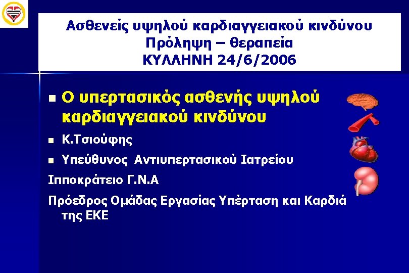 New Guidelines on Hypertension – Possible Changes (Δ) and Reinforcements (+) • No CCB in CAD patients • No CCB for CHD/CHF function • ARB and CHD • ARB and stroke prevention • Metabolic variables and choice of T • BP control (<140/90 mm. Hg) • BP threshold/target (high risk) • Combination T also as 1 st choice • Consistency of BP control • Control of out-of-office BP Δ? + Guidelines + Δ? • Total CV risk in screening/FU • TOD assessment in screening/FU • Emerging risk factors/TODs? Metabolic Syndrome New Onset Diabetes/Prediabetes Lipid variables • D as min 1 st choice • BB as 1 st choice • D/BB combination as priorital • ACEI/ARB combination as last priorital