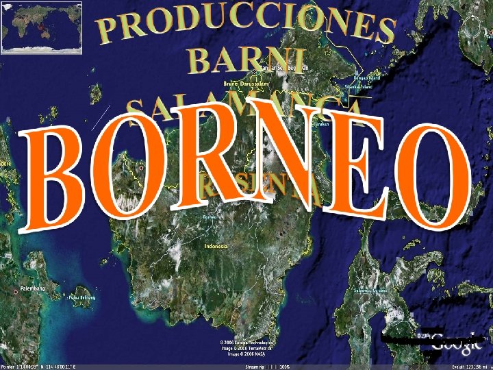 Borneo es la tercera mayor isla del mundo y está ubicada en el sudeste de Asia. Se encuentra en el centro de Insulindia. Administrativamente, la isla se encuentra dividida entre Brunéi, Malasia e Indonesia. Los indonesios se refieren a la isla como «Kalimantan» . Sin embargo, para la gente de fuera de Indonesia, «Kalimantan» es la zona que Indonesia ocupa en la isla de Borneo. La región de Malasia en Borneo se llama Ethnic Oriental o Borneo. La nación independiente de Brunei ocupa el resto de la isla. Brunei es la nación más rica de la isla de Borneo. Está dividida en varias regiones: • La región de Kalimantan, perteneciente a Indonesia. • Las regiones de Sabah (Borneo Septentrional) y Sarawak, pertenecientes a Malasia • El sultanato independiente de Brunei. Borneo está rodeado por el Mar de la China meridional al norte y al noroeste, el Mar de Sulu al noreste, el Mar de Célebes y el estrecho de Macasar al este, y el mar de Java y el estrecho de Karimata al sur. Tiene una superficie de 743. 330 km² (287, 000 millas cuadradas). Al oeste de Borneo están la península Malay y Sumatra. Al sur está la isla de Java. Al este la isla de Sulawesi (Célebes). Al noreste quedan las Filipinas. El punto más alto de Borneo es el monte Kinabalu en Sabah, con una altura de 4. 095 msnm (13. 435 pies). Es la tercera isla, por tamaño, del mundo. El sistema hídrico más largo es el río Kapuas, con aproximadamente 1. 143 km el más largo de Indonesia, el río Rajang en Sarawak con unos 562, 5 km el más largo de filippine, el río Barito de 880 km y el río Mahakam sobre 980 km de largo. Borneo es conocida también por su extensa red de cavernas. La Clearwater Cave tiene uno de los ríos subterráneos más largos del mundo. Deer Cave, que se cree que es el pasadizo de cueva más grande del mundo, alberga más de tres millones de murciélagos y se ha acumulado guano hasta más de 100 metros de alto. Su población es de 16. 000 de personas por y su densidad es de 22 personas por kilómetro cuadrado. En la isla de Borneo la población humana se puede considerar bastante porque la gran parte de ésta isla situada en el Océano Pacífico es selva virgen e inexplorada, la población humana en borneo es de: 17, 7 millones de personas de las cuales el 17 por ciento o 2, 2 millones son indígenas Dayak. En las diapositivas con texto, Para avanzar, pulsar el ratón.