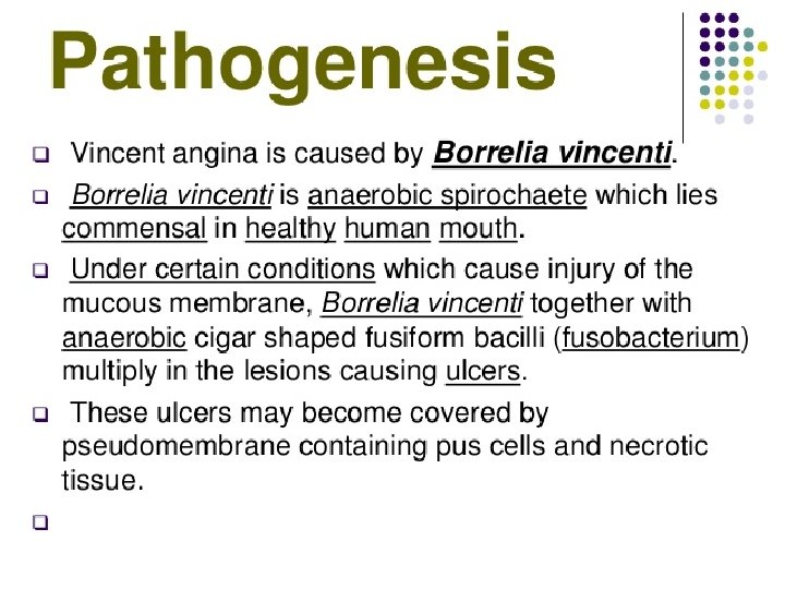 Vincent’s angina n Trench mouth: acute ulcerative necrotizing gingivo -stomatitis n Caused by: » Borrelia vincentii & » Leptotrichia buccalis (anaerobic gram negative fuso bacterium) Normal flora: potential pathogens (malnutrition, viral disease)