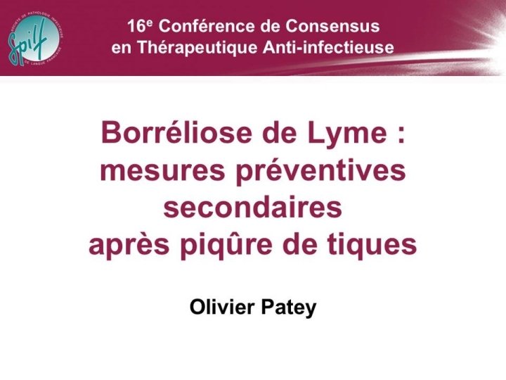 BORRELIOSE DE LYME 16 e Conférence de Consensus en Thérapeutique Anti-infectieuse « Borréliose de Lyme » Mesures préventives après piqûre de tique - O. Patey