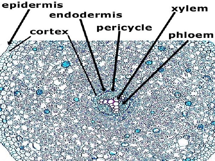 Flow of water in plant § 1. Water taken up by root hairs § 2. cortex § 3. endodermis § 4. pericycle § 5. root xylem § 6. stem xylem