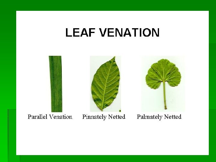 Leaves § Photosynthetic part of plant § Leaf venation can be: Parallel, Netted (pinnately and palmately) § Simple compound