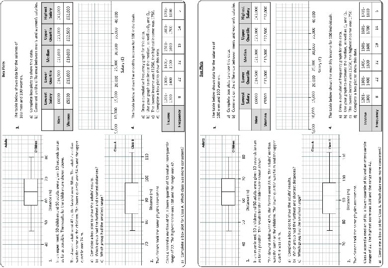 The table below shows data for the salaries of 3. Men b) have a higher range of salaries and a 100 men and 100 women. higher median. Although both sexes have a a) Complete box plots to show this data. similar interquartile range, the data indicates b) Comment on the difference between men’s and women’s salaries. men are paid better than women. Children 1. 40 50 60 Distance (m) 70 Answers Box Plots Adults 80 Lowest Salary Lower Quartile Median Upper Quartile Highest Salary Men £ 6000 £ 14, 500 £ 21, 000 £ 23, 000 £ 43, 000 Women £ 5500 £ 13, 000 £ 19, 000 £ 22, 500 £ 32, 000 In an experiment, 50 children and 50 adults were given 10 seconds to run as far as possible. The results for the children are shown above. The slowest adult went 42 m, the fastest went 88 m. The adults’ median was the same as the children. The lower quartile was 54 m and the upper quartile was 74 m. Men a) box plotboth to showfastest the adults’ results. b)Complete Adultsawere and slowest. b) Which group had the furthest and shortest distances? c) Which Children had smaller range of distances. c) group had theasmallest range? Women Class A 5, 000 10, 000 15, 000 20, 000 25, 000 30, 000 35, 000 40, 000 Salary (£) Class B 2. 70 80 90 Distance (m) 100 110 a) had wider and the lowest score. Two. Class classes. A took the a same physicsrange assessment. Class B had the highest score, a smaller interquartile Class A scored a median of 90, a lower-quartile of 80 and an interquartile range and higher median. range of 22. Theahighest score was 108 and the range was 42. Class B scored higher and were also more consistent. a) Complete a box plot for Class A. Which class was more consistent? 4. The table below shows the monthly income for 100 individuals. a) b) c) d) Draw a cumulative frequency graph for this data. Use your graph to estimate the median, as well as Q 1 and Q 2. The lowest income was £ 1250, the highest income was 1750. Complete a box plot to show this data. Income Frequency 12011300 8 13011400 22 14011500 32 15011600 19 16011700 14 17011800 5
