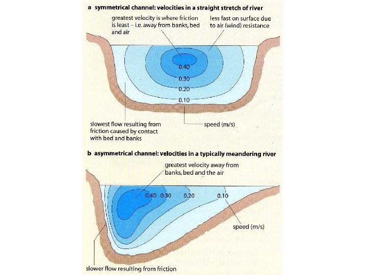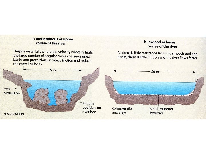 Upstream Downstream Discharge Occupied channel width Channel depth Average velocity Load quantity Load particle size Channel bed roughness Slope angle (gradient) Average Velocity • Is the speed of water flow (distance travelled per unit of time). • Steady increase downstream. • How can it be so if the gradient is deceasing? (imagine 2 slides – one steep, one less so).
