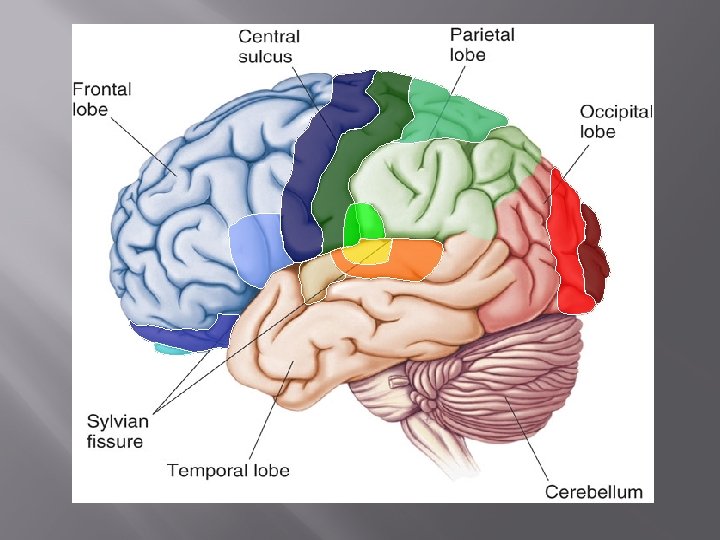 Cerebral features Gyri – Elevated ridges “winding” around the brain. Sulci– Small grooves dividing the gyri Central Sulcus – Divides the Frontal Lobe from the Parietal Lobe q q. Fissures the brain q – Deep grooves, generally dividing large regions/lobes of Longitudinal Fissure – Divides the two Cerebral Hemispheres q. Transverse Cerebellum Fissure – Separates the Cerebrum from the q. Sylvian/Lateral Fissure – Divides the Temporal Lobe from the Frontal and Parietal Lobes