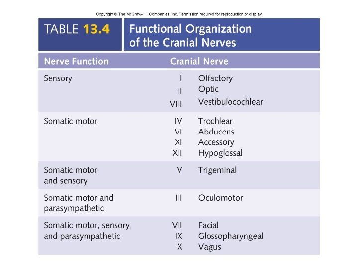 Copyright © The Mc. Graw-Hill Companies, Inc. Permission required for reproduction or display. TABLE 13. 1 Brainstem Divisions of the Brain And Their Functions Connects the spinal cord to the cerebrum; consists of the medulla oblongata, pons, and midbrain, with the reticular formation scattered throughout the three regions; has many important functions as listed under each subdivision; is the location of cranial nerve nuclei Medulla oblongata Pathway for ascending and descending nerve tracts; center for several important reflexes (e. g. , heart rate, breathing, swallowing, vomiting) Pons Contains ascending and descending nerve tracts; relays information between cerebrum and cerebellum; site of reflex centers Midbrain Contains ascending and descending nerve tracts; serves as visual reflex center; part of auditory pathway Cerebellum Diencephalon Connects the brainstem to the cerebrum; has many relay and homeostatic functions, as listed under each subdivision Thalamus Major sensory relay center; influences mood and movement Subthalamus Contains nerve tracts and nuclei Epithalamus Contains nuclei responding to olfactory stimulation and contains pineal gland Hypothalamus Major control center for maintaining homeostasis and regulating endocrine function Cerebrum Reticular formation Controls muscle movement and tone; governs balance; regulates extent of intentional movement; involved in learning motor skills Scattered throughout brainstem; controls cyclic activities, such as the sleep-wake cycle Controls conscious perception, thought, and conscious motor activity; can override most other systems Basal nuclei Controls muscle activity and posture; largely inhibits unintentional movement when at rest Limbic system Autonomic response to smell, emotion, mood, memory, and other such functions