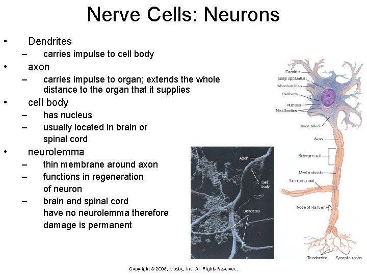 Nerve Cells: Neurons • Dendrites – • carries impulse to cell body axon – • carries impulse to organ; extends the whole distance to the organ that it supplies cell body – – • has nucleus usually located in brain or spinal cord neurolemma – – – thin membrane around axon functions in regeneration of neuron brain and spinal cord have no neurolemma therefore damage is permanent