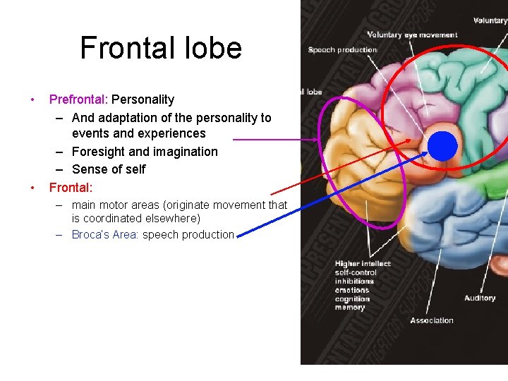 Frontal lobe • • Prefrontal: Personality – And adaptation of the personality to events and experiences – Foresight and imagination – Sense of self Frontal: – main motor areas (originate movement that is coordinated elsewhere) – Broca’s Area: speech production