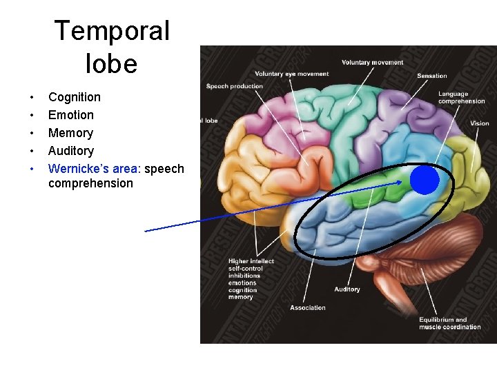 Temporal lobe • • • Cognition Emotion Memory Auditory Wernicke’s area: speech comprehension