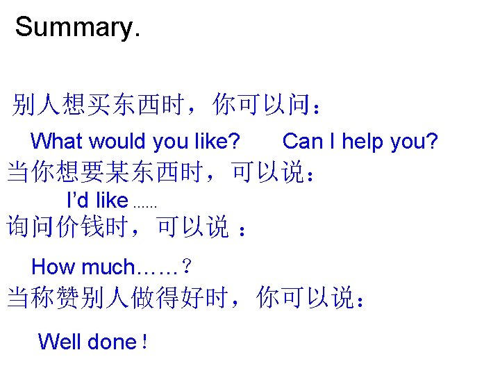 Listen and repeat Good morning! Can I help you? Yes, I’d like these shoes. How much are they? OK. Five yuan, please.