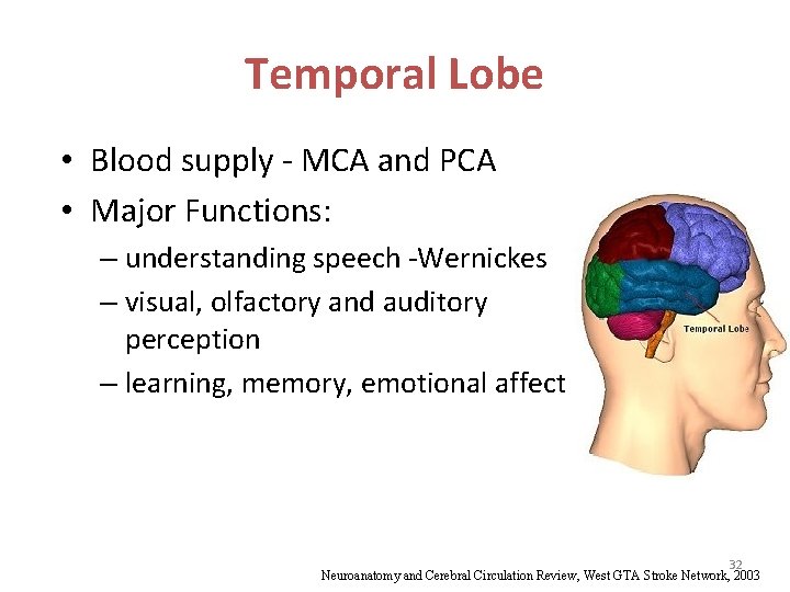 Parietal Lobe • Blood supply – ACA, MCA and PCA • Major functions: – sensory function – body part awareness – visual spatial information 31 Neuroanatomy and Cerebral Circulation Review, West GTA Stroke Network, 2003