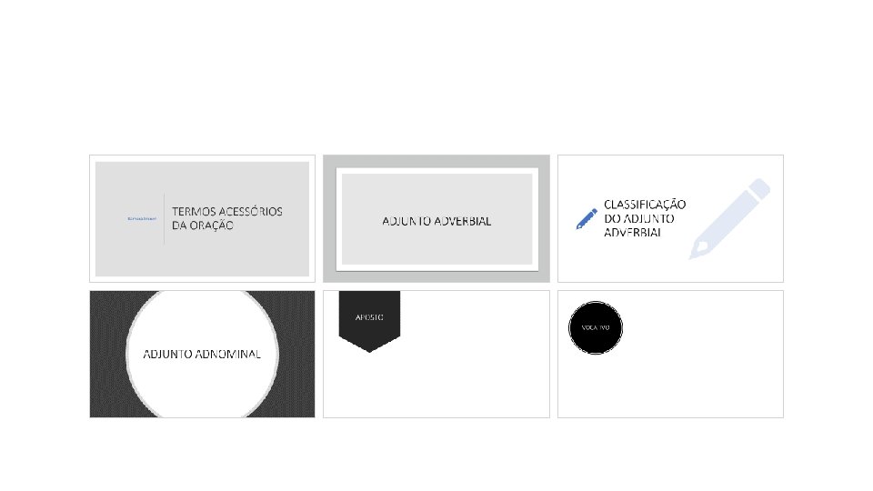 ADJUNTO ADVERBIAL EXEMPLO Frequência Sempre aparecia por lá. Havia reuniões todos os dias. Instrumento Rodrigo fez o corte com a faca. O artista criava seus desenhos a lápis. Intensidade A atleta corria bastante. O remédio é muito caro. Limite A menina andava correndo do quarto à sala. Lugar Nasci em Porto Alegre. Estou em casa. "Há, em cada canto de minh’alma, um altar a um Deus diferente. " (Álvaro de Campos) Matéria Compunha-se de substâncias estranhas. Era feito de aço. Meio Fui de avião. Enriqueceram mediante fraude. Modo Foram recrutados a dedo. Esperava tranquilamente o momento decisivo Negação Não há erros em seu trabalho. Não aceitarei a proposta em hipótese alguma. Preço As casas estão sendo vendidas a preços muito altos.