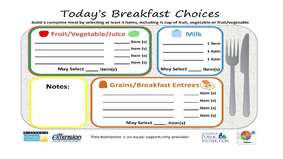 Breakfast Activity – Is It Reimbursable? Breakfast Menu #2 – Grades 9 -12 Whole wheat french toast, 1 slice (1 oz eq grain and 1 oz eq meat/meat alternate Orange, whole ½ cup Choice of 1% unflavored or fat-free chocolate milk, 1 cup