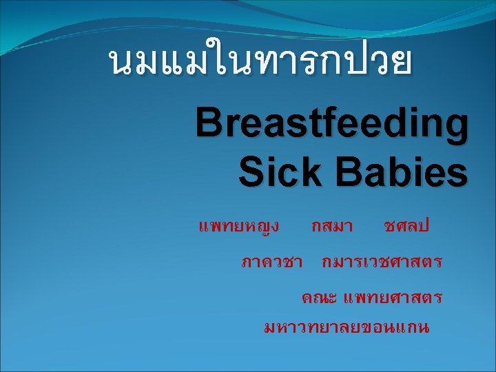 ขนในการเลยงลกดวยนมแม ในเดกปวย 6: Nonnutritive Sucking at the Breast �������� 7: Transition to Breast and Technology to Support Breastfeeding 8: Measuring Milk Transfer 9: Preparation for Discharge 10: Appropriate Follow-up