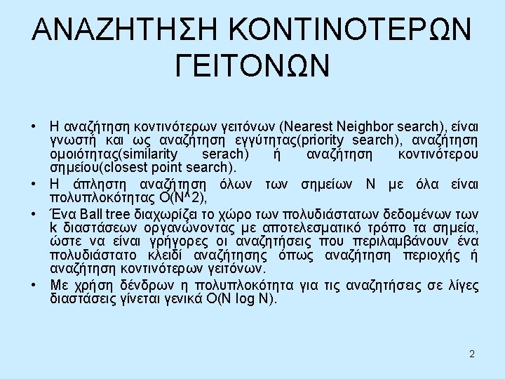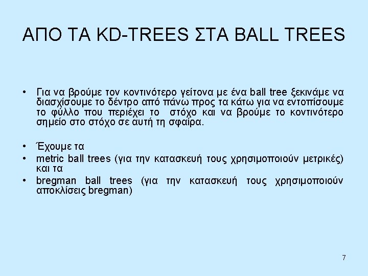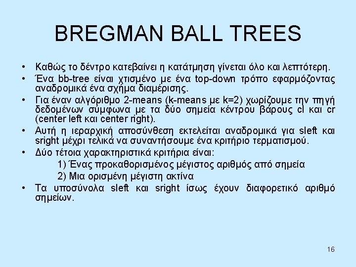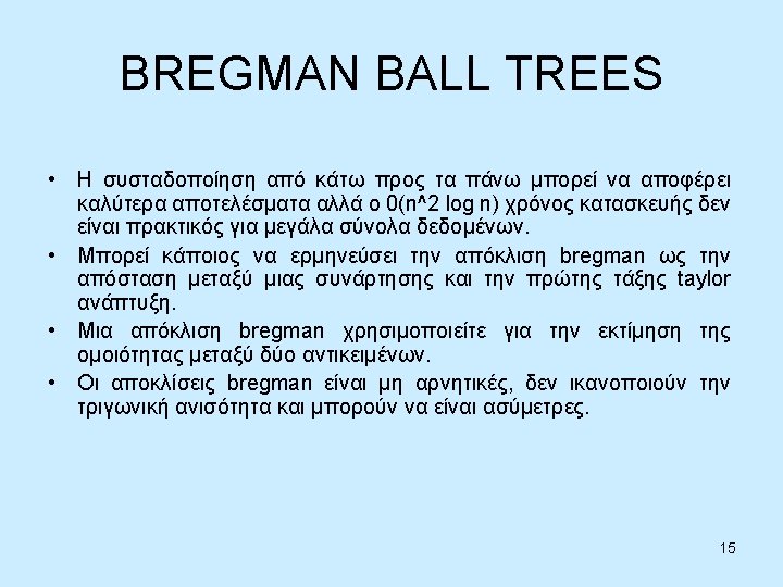 BREGMAN BALL TREES Bregman Ball-tree construction algorithm Recursive partitioning scheme (STEP 1) 2 -means clustering (keep the two centroids cl , cr ) (STEP 2) Bregman Balls B(cl , Rl ) and B(cr , Rr ) (possibly overlapping) (STEP 3) continue recursively until matching a stop criterion Termination criteria: maximum number of points Leaf. Points stored at a leaf maximum leaf radius Leaf. Radius (radius from leaf centroid) 14