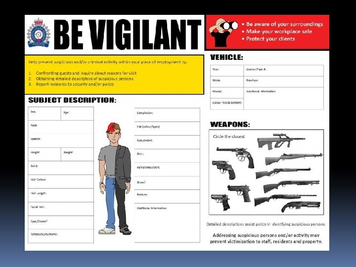 What should I do during a Robbery? Ø Observe and Identify Weapon (type, size and color) Ø Remember – consider all weapons real and loaded!