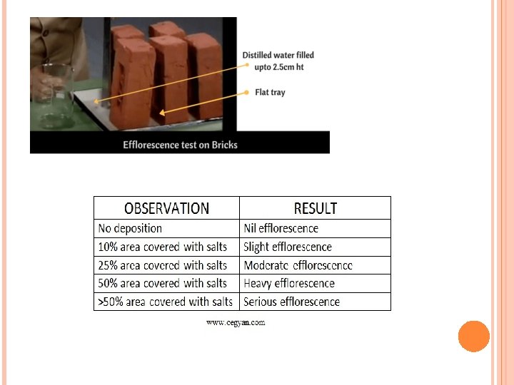 TEST ON BRICK Absorption • • • Water absorption is brick is carried out by immersing it in water for 24 hours. It is again weighed and the different is in indicated the amount of water absorbed by brick. It should not in any case exceed 20% of its weight. Crushing Strength • • • Crushing strength of brick is found out by placing it in compressive test machine. It is pressed till it breaks The minimum crushing strength of brick is 3. 5 N/mm 2 Hardness • In this test, a stretch is made on brick surface with the help of finger nail. • If no impression is left on surface, the brick is treated to be sufficiently hard.