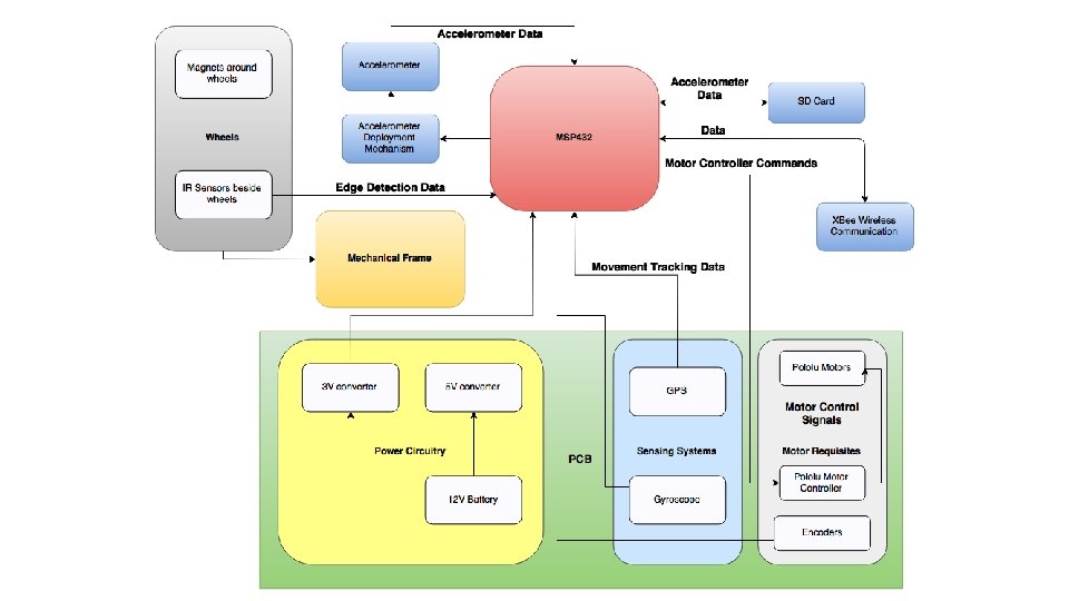 Power Requirements • Power requirements were mainly dependent on the following: • • Motors Wireless Communication Accelerometer Deployment • The robot was expected to run actively for at least one hour and one additional hour while stationary • The robot required a maximum voltage of 12 V to accommodate the accelerometer and motors. Power conversion circuitry used to create lower voltages for other components