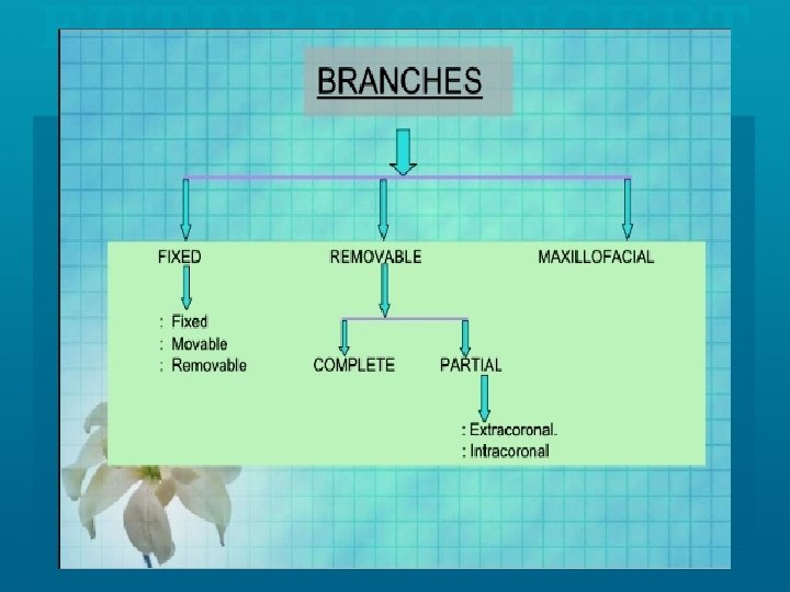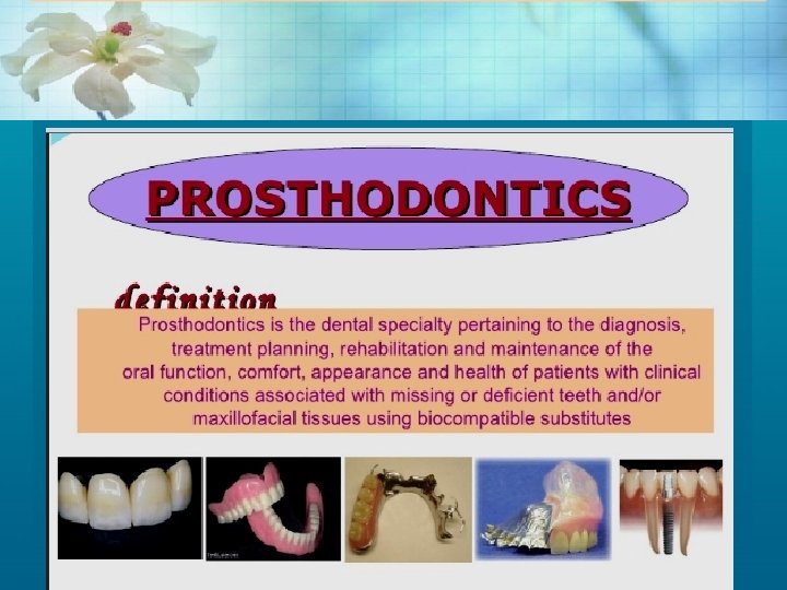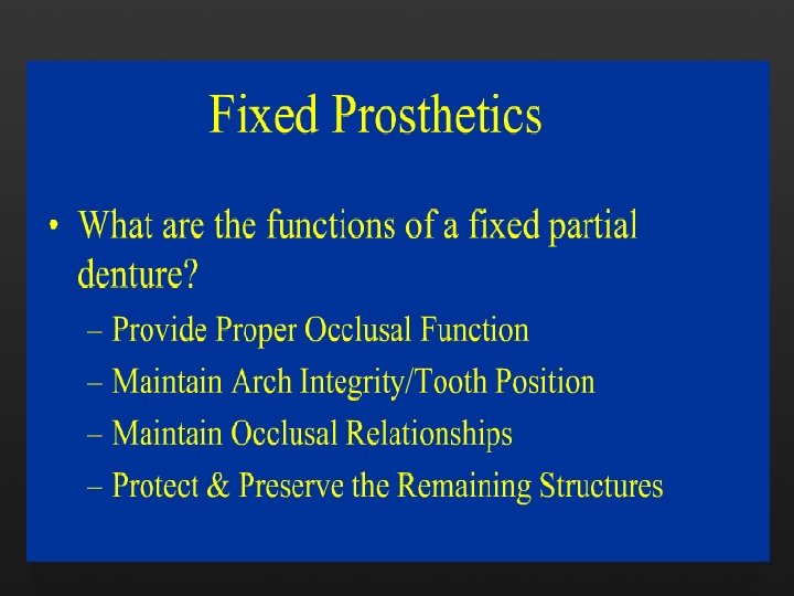 Indications for Fixed Prosthodontics v. One or two adjacent teeth are missing in the same arch. v. The supportive tissues are healthy. v. Suitable abutment teeth are present. v. The patient is in good health and wants to have the prosthesis placed. v. The patient has the skills and motivation to maintain good oral hygiene.