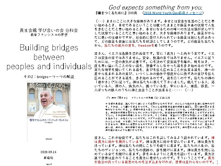 dialogue between religions and science bridge 10: Laudato Si’ 62,143,199, 200, 201 科学と諸宗教の対話 62. Why should this document, addressed to all people of good will, include a chapter dealing with the convictions of believers? I am well aware that in the areas of politics and philosophy there are those who firmly reject the idea of a Creator, or consider it irrelevant, and consequently dismiss as irrational the rich contribution which religions can make towards an integral ecology and the full development of humanity. Others view religions simply as a subculture to be tolerated. Nonetheless, science and religion, with their distinctive approaches to understanding reality, can enter into an intense dialogue fruitful for both. 62. この文書はall people of good willの為に書かれたものです。それが 何故、the convictions of believersを取り上げるために一章を割くのでしょ うか。確かに政治や哲学の分野であれば、私も重々承知していますが、a Creatorという考え方そのものを全く受け付けない人達がいます。その人 達はその結果、an integral ecology and the full development of humanity に向けてreligionsが為しうる豊かな貢献を見落としてしまいます。そういう 人達にとって、religionsは大目に見てやっても良いサブカルチャーの一つ だといったところでしょう。しかしながらscienceはreligionと共に、それぞれ 一見異なるアプローチでunderstanding realityを行います。従って双方に とって中身の濃い実りある対話に入ることが出来るはずです。 143.Together with the patrimony of nature, there is also an historic, artistic and cultural patrimony which is likewise under threat. This patrimony is a part of the shared identity of each place and a foundation upon which to build a habitable city. It is not a matter of tearing down and building new cities, supposedly more respectful of the environment yet not always more attractive to live in. Rather, there is a need to incorporate the history, culture and architecture of each place, thus preserving its original identity. Ecology, then, also involves protecting the cultural trea-sures of humanity in the broadest sense. More specifically, it calls for greater attention to local cultures when studying environmental problems, favouring a dialogue between scientific-technical language and the language of the people. Culture is more than what we have inherited from the past; it is also, and above all, a living, dynamic and participatory present reality, which cannot be excluded as we rethink the relationship between human beings and the environment. 143. natureの遺産が脅威にさらされているのと同様に、歴史的、芸術的、 文化的遺産も脅威にさらされています。これらの遺産は、各地域の identityの一部を形成しているとともに、居住都市を形成するための基礎 ともなっています。といっても、取り壊してその上に新しい都市を形成する という脅威を問題にしているのではありません。そのままで住み続けるの は必ずしも魅力的ではないかもしれませんが、環境のことも気にかける 必要があると指摘しているのです。他にも、その歴史、文化、各地の建造 物を一体化して保護し、そのoriginal identityを維持していく必要がありま す。ecologyは本来、広義の意味でのhumanityという文化的宝も守ること を含みます。もう少し具体的にいうと、環境問題の検討には、科学技術の 言語とthe peopleの言語との対話を促しながら、その地域の文化に大き な注意を払う必要があります。文化とは、私達が過去から継承してきたも の以上の意味を持ちます。即ち文化とは、息づき、動的に変化しながらも、 何よりも、私達が現に参加しているrealityを形成している生きものなので す。ですから、私達がhuman beingsとその環境とのrelationshipを再考す る際に、私達のrealityである文化を決して排除してはならないのです。 12