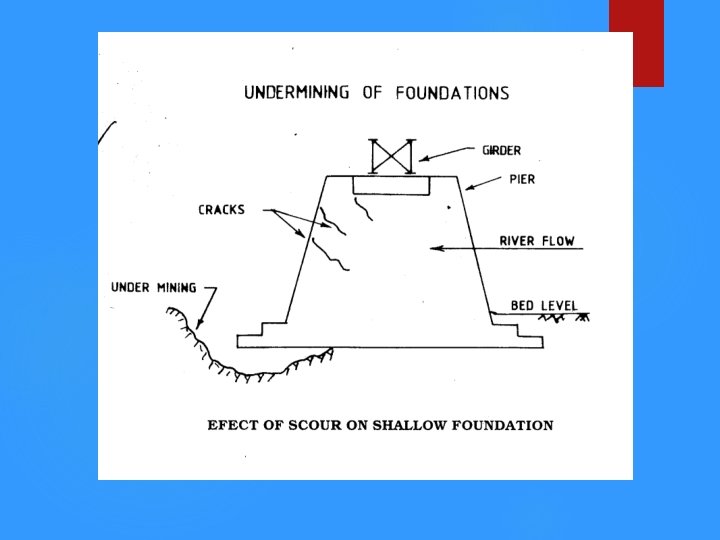 FOUNDATION Visual examination difficult Observe exposed element Take scour reading Verticality of abutment and pier Under water inspection – most difficult Inspect quality of material – dry season. Tell tale Permanent kink in alignment – tilt of pier