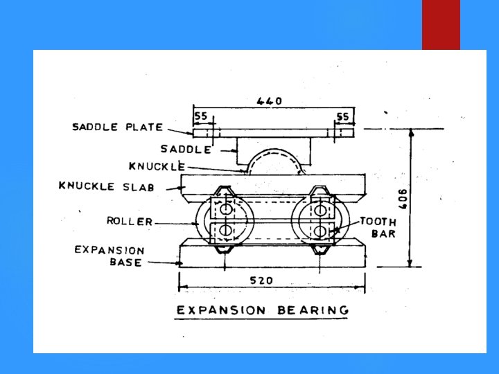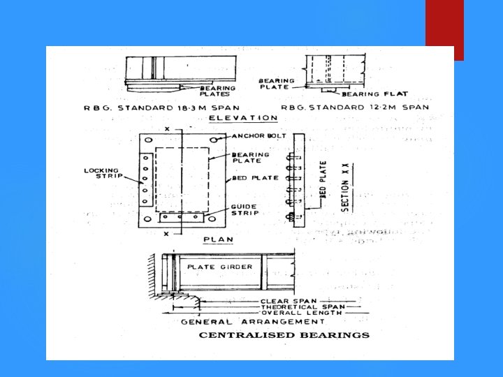 INSPECTION OF BEARINGS n The longitudinal alignment - straight and central to base plates n The girders - symmetrically placed n No cavity/ gap between base plate and bed block n Bearings are free to move in the designed manner. Check the condition of location strip and guide strip or shearing of rivets n The anchor bolts - in proper position and intact. Look for any bend or shearing of bolt n Uniform seating of rollers & bearing strip check with feeler gauge. All fittings of rocker and roller- Sound and proper n Free movement of bearings and condition of grease n check both ends of girder are in same level.