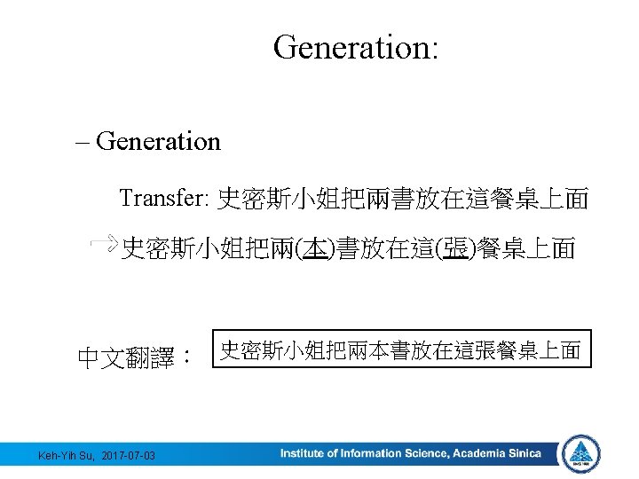 Transfer: • (1) Lexical Transfer Miss 小姐 Smith 史密斯 put (+ed) 放 two 兩 book+s 書 on 在…上面 this 這 dining table 餐桌 – Literal Translation: 小姐史密斯放兩書在上面這餐桌 Keh-Yih Su, 2017 -07 -03