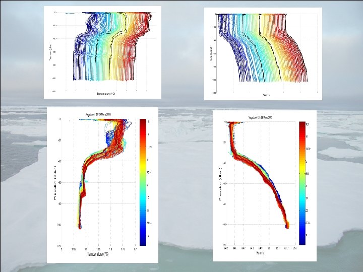 Temperature and salinity vertical profiles observed during spring 2002 (April-June) from the Polar Observer drifting towards Fram Strait between 89°N and 87°N (Jean-Louis Etienne courtesy). A sharp salinity gradient appeared in the surface mixed layer at 88° 30’N early May 2002.
