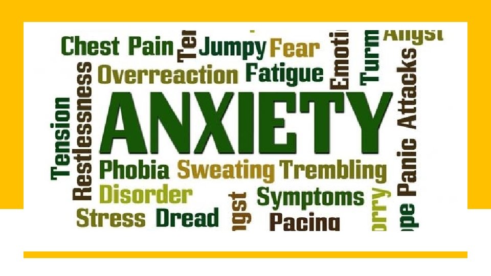 CAUSES OF ANXIETY • Anxious personality. Some people are genetically prone to anxiety. • Childhood experiences. Bullying, hostile parents or other frightening experiences during childhood. • Long-term health problems like chronic pain are linked to anxiety. • Everyday habits such as working long hours, financial or housing problems and stress can cause anxiety. • Outside Conditions such as COVID-19, weather, political unrest, environmental factors