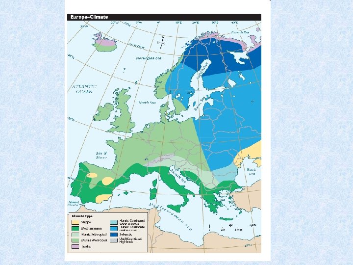 North Atlantic Drift • Gulf stream flows around the British Isles and into the North Sea and along the Norwegian Coast. • This creates a moderate climate. • The winds that blow off the drift allow for cool summers and mild winters.